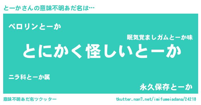 | 男性向けラノベタイトル風あだ名 | 『とーかの嫁は女の子じゃないと思った?』 |