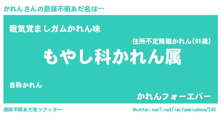 | 男性向けラノベタイトル風あだ名 | 『転生したらかれんだった件』 |