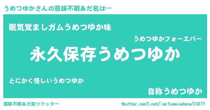 | 女子向けラノベタイトル風あだ名 | 『異世界で失敗しない100のうめつゆか』 |