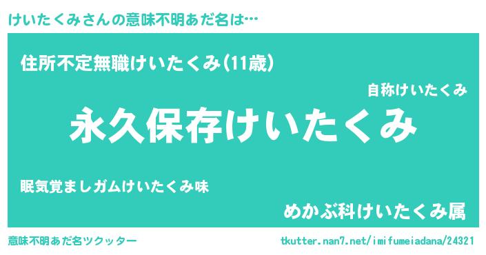 | 男性向けラノベタイトル風あだ名 | 『けいたくみという概念が存在しない退屈な世界 』 |