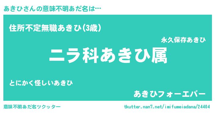 | 男性向けラノベタイトル風あだ名 | 『あきひ~年齢イコール彼女いない歴の魔法使い~』 |