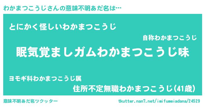 | 男性向けラノベタイトル風あだ名 | 『おまえをオタクにしてやるから、俺をわかまつこうじにしてくれ! 』 |