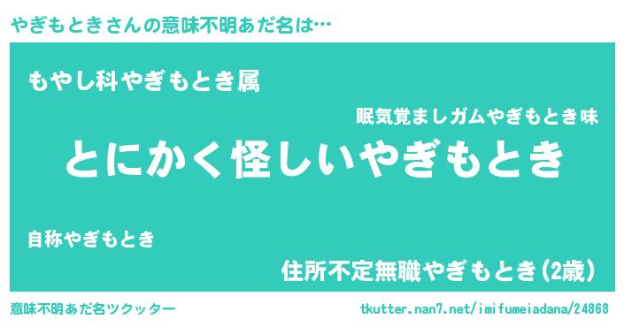 | 男性向けラノベタイトル風あだ名 | 『ダンジョンにやぎもときを求めるのは間違っているだろうか』 |