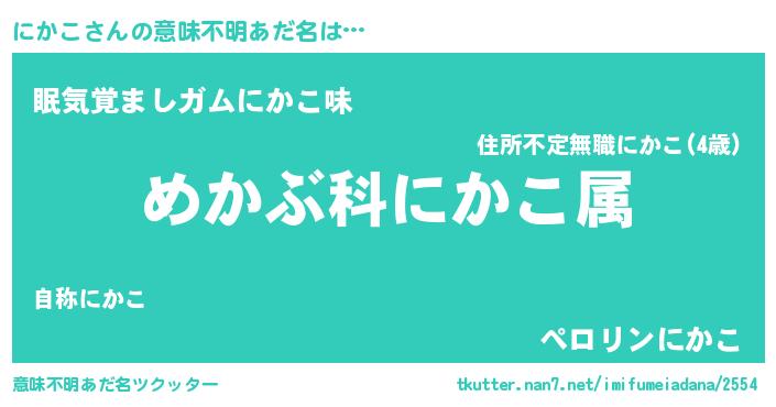 | 男性向けラノベタイトル風あだ名 | 『ニカコスレイヤー』『魔弾の王とにかこ』 |
