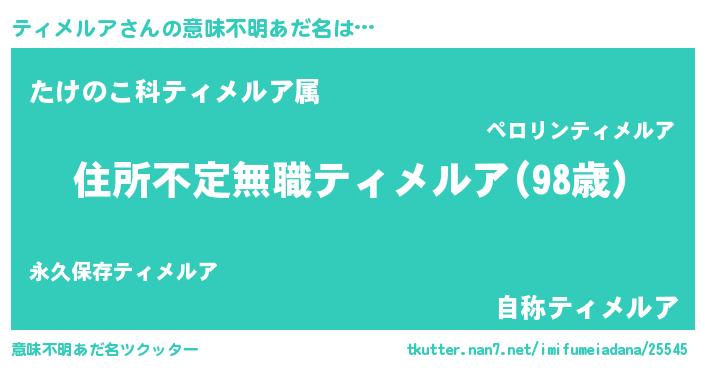 | 男性向けラノベタイトル風あだ名 | 『この素晴らしい世界にティメルアを!』 |