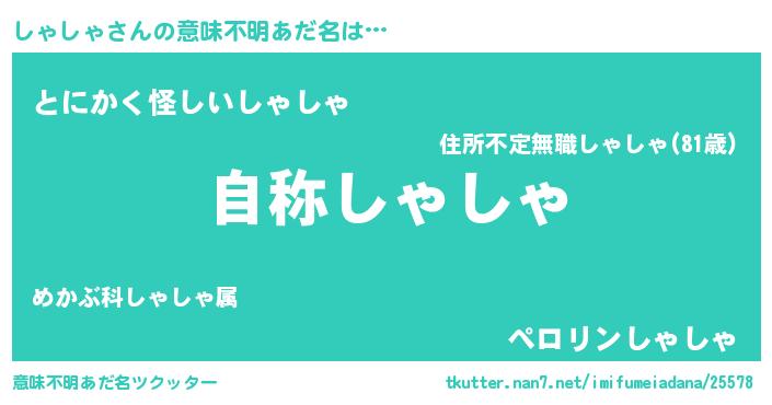 | 男性向けラノベタイトル風あだ名 | 『Re:しゃしゃから始める異世界生活』 |