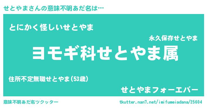 | 男性向けラノベタイトル風あだ名 | 『せとやま~年齢イコール彼女いない歴の魔法使い~』 |