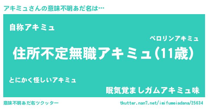 | 女子向けラノベタイトル風あだ名 | 『アキミュが死なない童話 林檎のアキミュの診療簿』 |