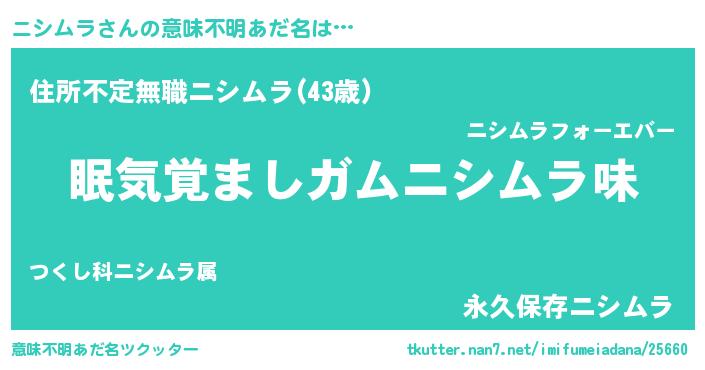 | 男性向けラノベタイトル風あだ名 | 『おまえをオタクにしてやるから、俺をニシムラにしてくれ! 』 |