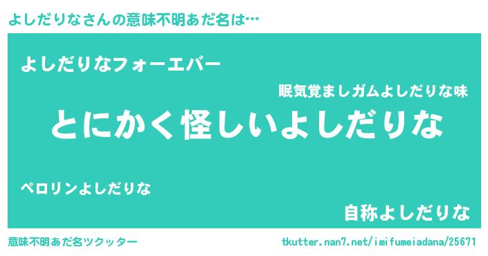 | ヒーロー風カッコイイあだ名 | 『天弓騎士ヨシ』『超時空戦士ヨシダリナ』 |
