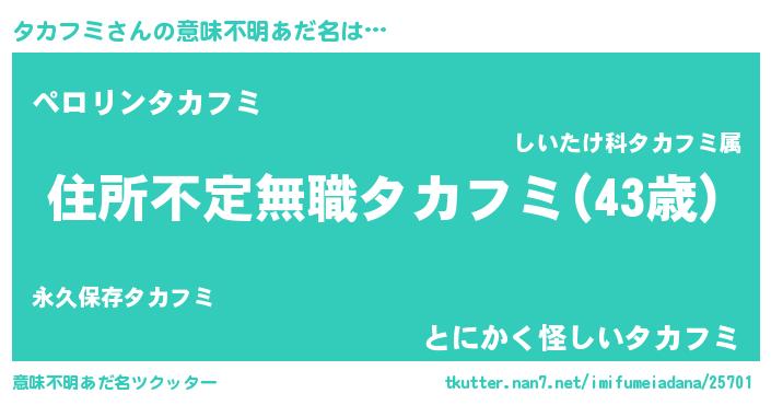 | 男性向けラノベタイトル風あだ名 | 『この素晴らしい世界にタカフミを!』 |