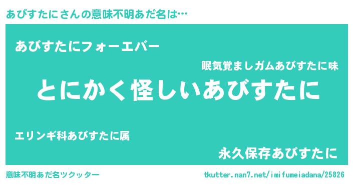 | 男性向けラノベタイトル風あだ名 | 『あびすたにの嫁は女の子じゃないと思った?』 |