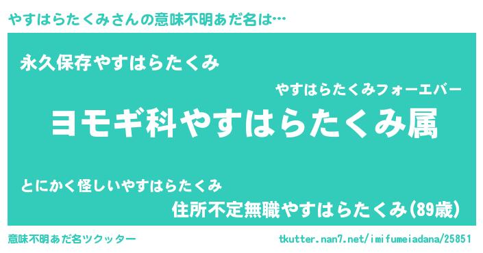 | ヘコむあだ名 | 『やすはらたくみ(遠い目)』『つくし』 |
