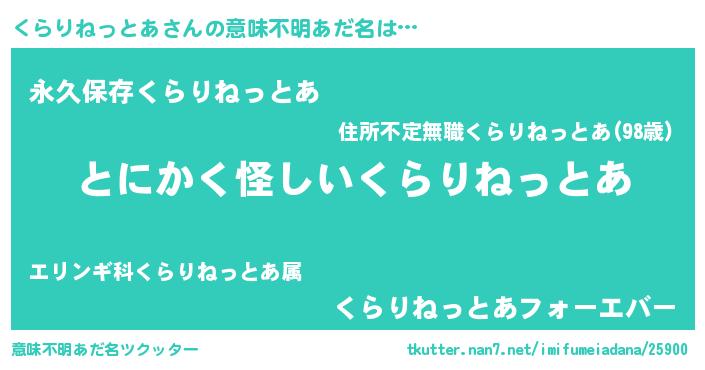 | 女子向けラノベタイトル風あだ名 | 『くらりねっとあの卵を拾いまして』 |