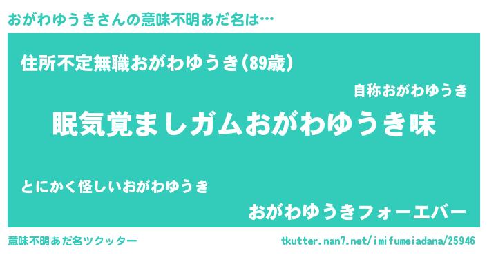 | 男性向けラノベタイトル風あだ名 | 『おまえをオタクにしてやるから、俺をおがわゆうきにしてくれ! 』 |