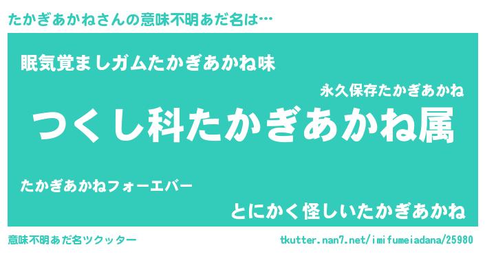 | 男性向けラノベタイトル風あだ名 | 『たかぎあかね~年齢イコール彼女いない歴の魔法使い~』 |