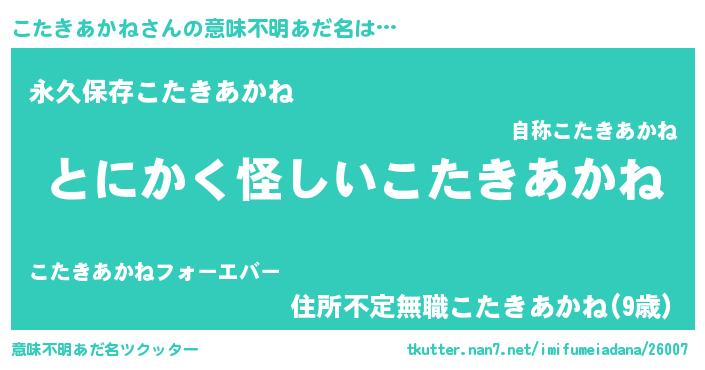| 男性向けラノベタイトル風あだ名 | 『こたきあかねの嫁は女の子じゃないと思った?』 |