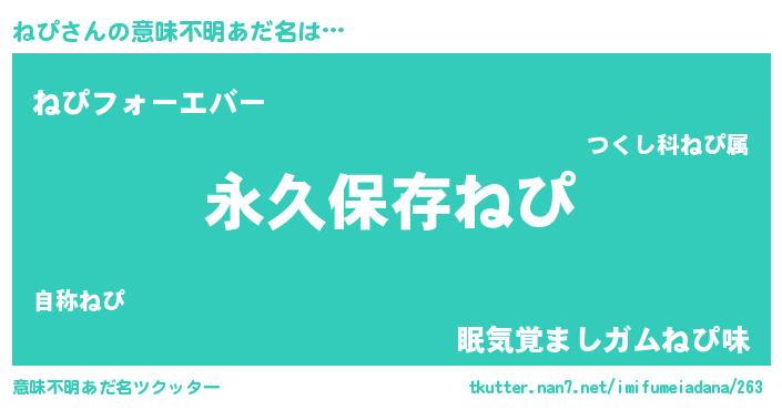 | 男性向けラノベタイトル風あだ名 | 『ねぴという概念が存在しない退屈な世界 』 |