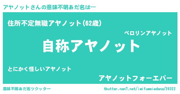 | 男性向けラノベタイトル風あだ名 | 『Re:アヤノットから始める異世界生活』 |
