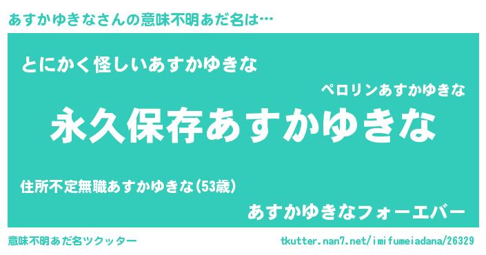 | 男性向けラノベタイトル風あだ名 | 『あすかゆきなという概念が存在しない退屈な世界 』 |
