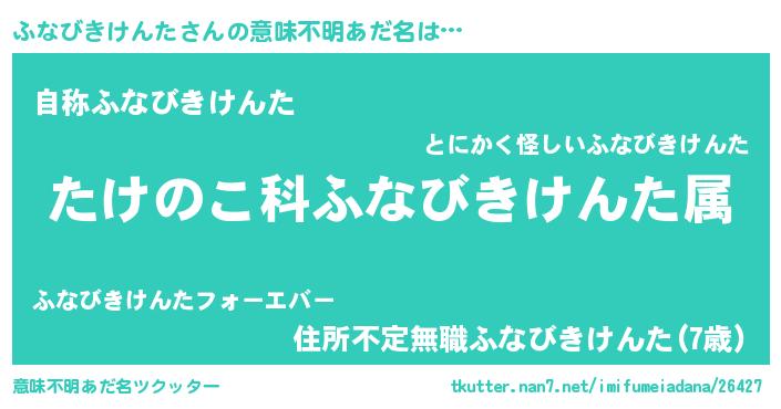 | 男性向けラノベタイトル風あだ名 | 『転生したらふなびきけんただった件』 |