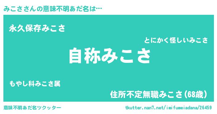 | 男性向けラノベタイトル風あだ名 | 『みこさに滅ぼされるだけの簡単なお仕事です』 |