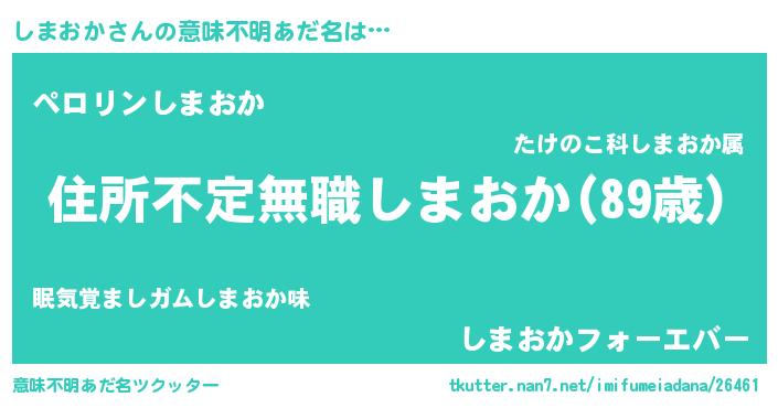 | 男性向けラノベタイトル風あだ名 | 『この素晴らしい世界にしまおかを!』 |