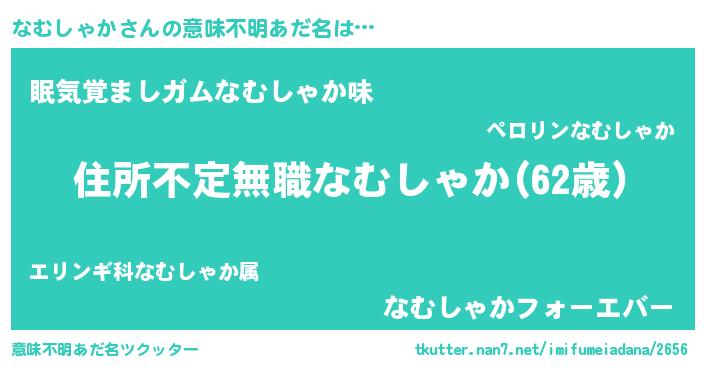 | 男性向けラノベタイトル風あだ名 | 『なむしゃかに滅ぼされるだけの簡単なお仕事です』 |