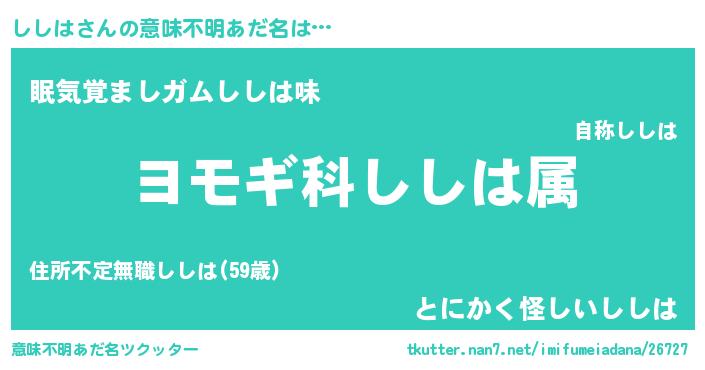 男性向けラノベタイトル風あだ名 | 『ししは~年齢イコール彼女いない歴の魔法使い~』 |