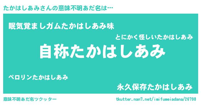 | ヘコむあだ名 | 『たかはしあみ(爆)』『たかお』 |