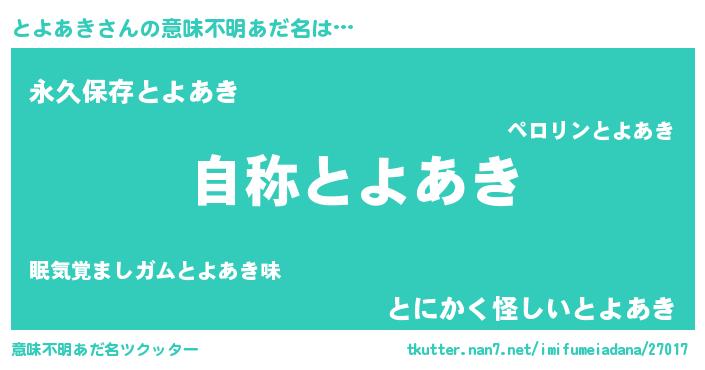 | 男性向けラノベタイトル風あだ名 | 『Re:とよあきから始める異世界生活』 |
