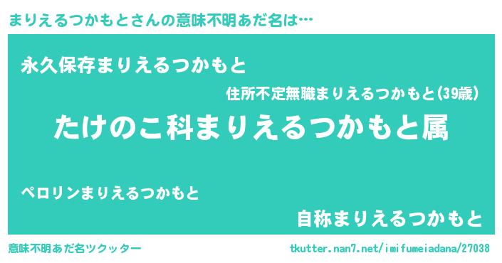 | 胡散臭い通販商品みたいなあだ名 | 『来世でも幸せになれる水素水…その名も「まりえるつかもと」』 |