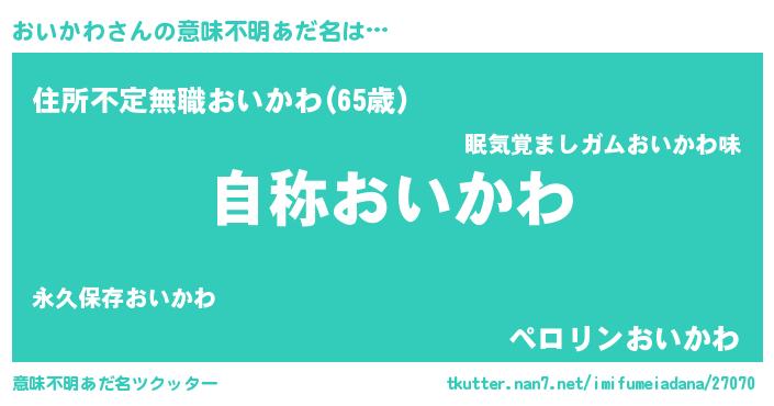| 男性向けラノベタイトル風あだ名 | 『Re:おいかわから始める異世界生活』 |