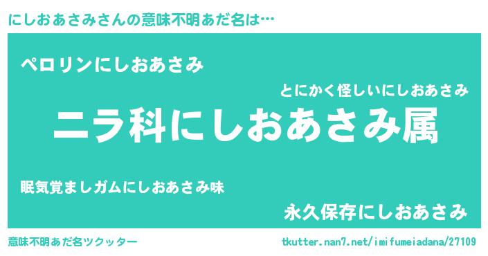 | 男性向けラノベタイトル風あだ名 | 『にしおあさみ~年齢イコール彼女いない歴の魔法使い~』 |