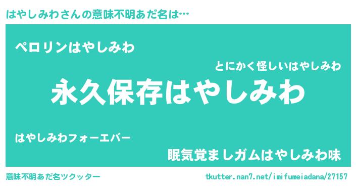 | 男性向けラノベタイトル風あだ名 | 『はやしみわという概念が存在しない退屈な世界 』 |