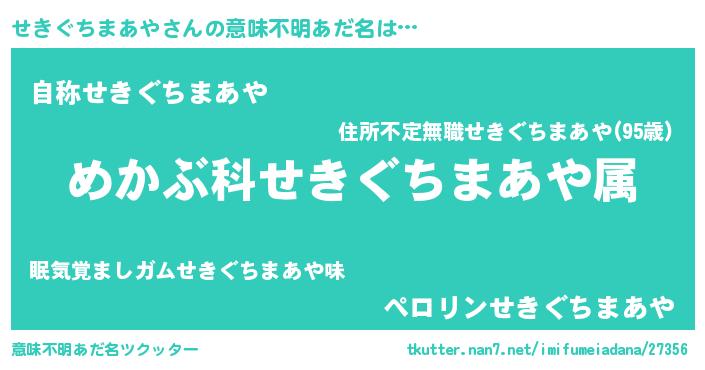 | 胡散臭い通販商品みたいなあだ名 | 『ガンによく効く高麗人参…その名も「せきぐちまあや」』 |