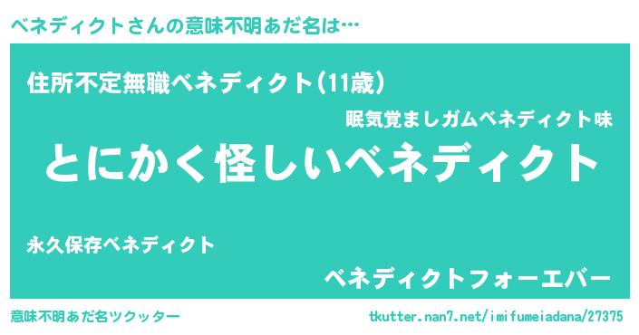 | 男性向けラノベタイトル風あだ名 | 『ベネディクトの嫁は女の子じゃないと思った?』 |
