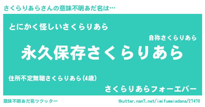 | 男性向けラノベタイトル風あだ名 | 『さくらりあらという概念が存在しない退屈な世界 』 |