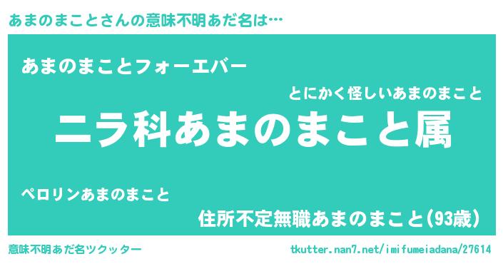 | 男性向けラノベタイトル風あだ名 | 『あまのまこと~年齢イコール彼女いない歴の魔法使い~』 |