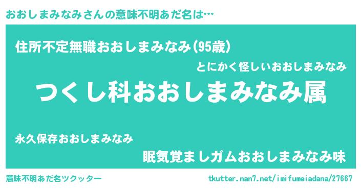 | 欧米人風あだ名 | 『おおしまみなみ・ステッグマイヤー』 |