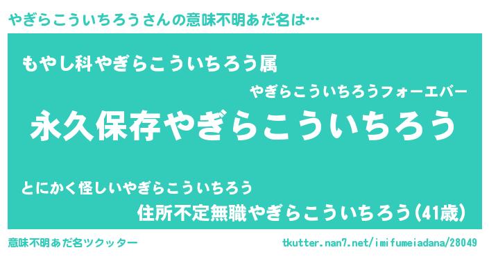 | 男性向けラノベタイトル風あだ名 | 『やぎらこういちろうという概念が存在しない退屈な世界 』 |