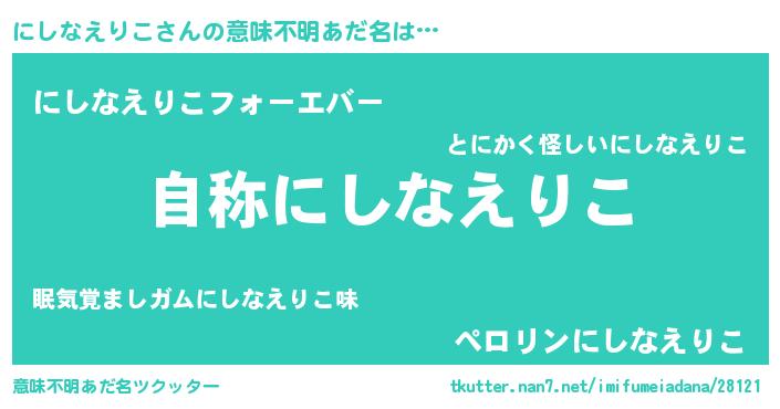 | 男性向けラノベタイトル風あだ名 | 『Re:にしなえりこから始める異世界生活』 |