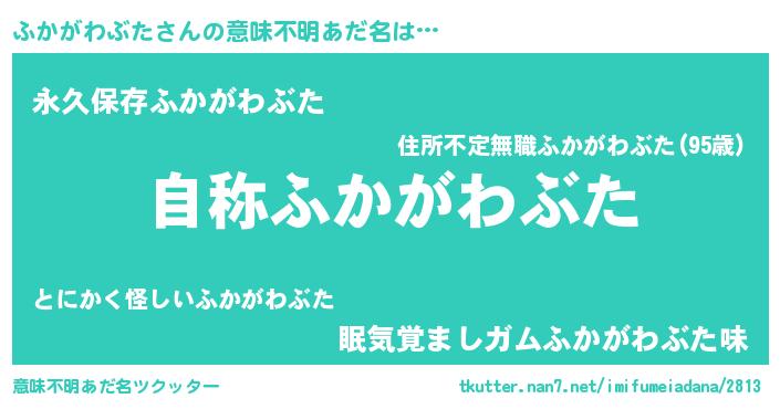 | 男性向けラノベタイトル風あだ名 | 『ふかがわぶたに滅ぼされるだけの簡単なお仕事です』 |
