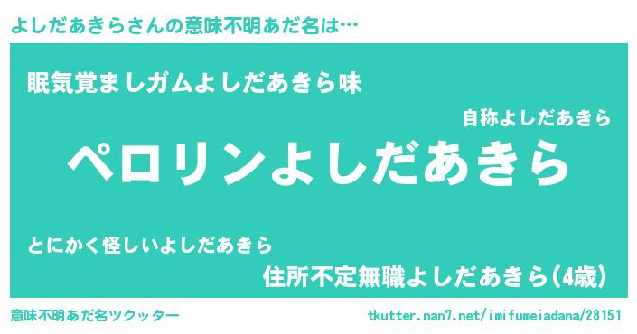 | 男性向けラノベタイトル風あだ名 | 『うちのよしだあきらが世界を掌握している!』 |