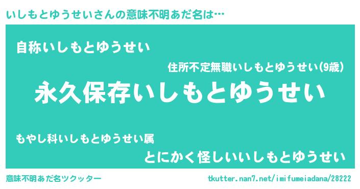 | 女子向けラノベタイトル風あだ名 | 『異世界で失敗しない100のいしもとゆうせい』 |