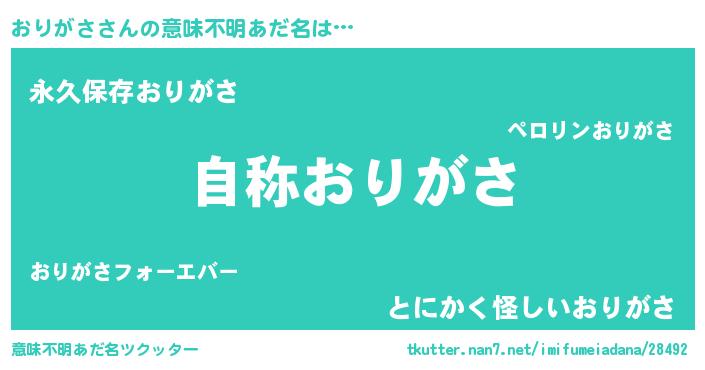 | 男性向けラノベタイトル風あだ名 | 『Re:おりがさから始める異世界生活』 |