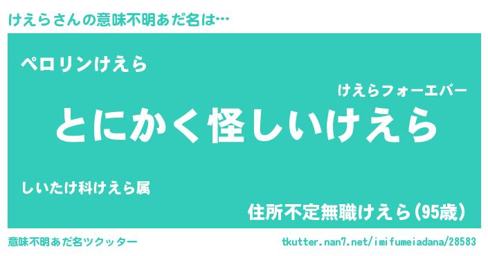 | 女子向けラノベタイトル風あだ名 | 『けえらの卵を拾いまして』 |