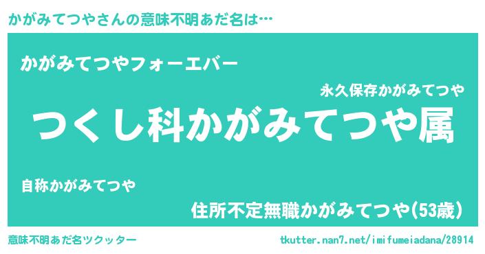 | 男性向けラノベタイトル風あだ名 | 『かがみてつや~年齢イコール彼女いない歴の魔法使い~』 |