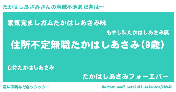 | 男性向けラノベタイトル風あだ名 | 『魔弾の王とたかはしあさみ』 |