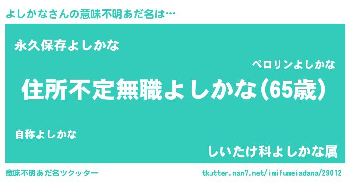 | 男性向けラノベタイトル風あだ名 | 『魔弾の王とよしかな』『よしかなの憂鬱』 |